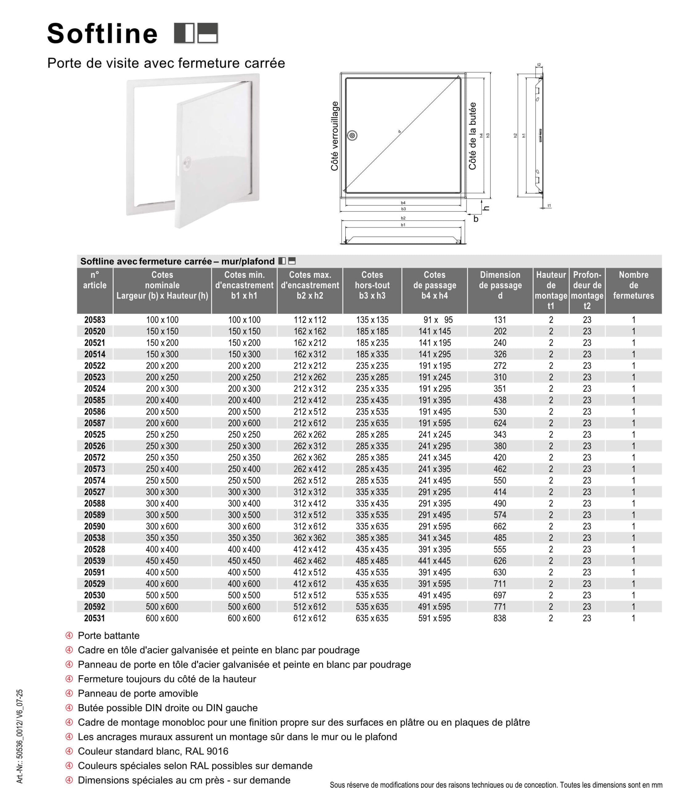 La trappe de visite Softline avec fermeture carrée est conçue pour offrir un accès discret et sécurisé dans vos murs et plafonds. Fabriquée en acier galvanisé peint blanc RAL 9016, elle s’intègre parfaitement grâce à son cadre monobloc et son panneau amovible. Idéale pour accéder à la VMC, aux réseaux électriques ou aux gaines techniques.