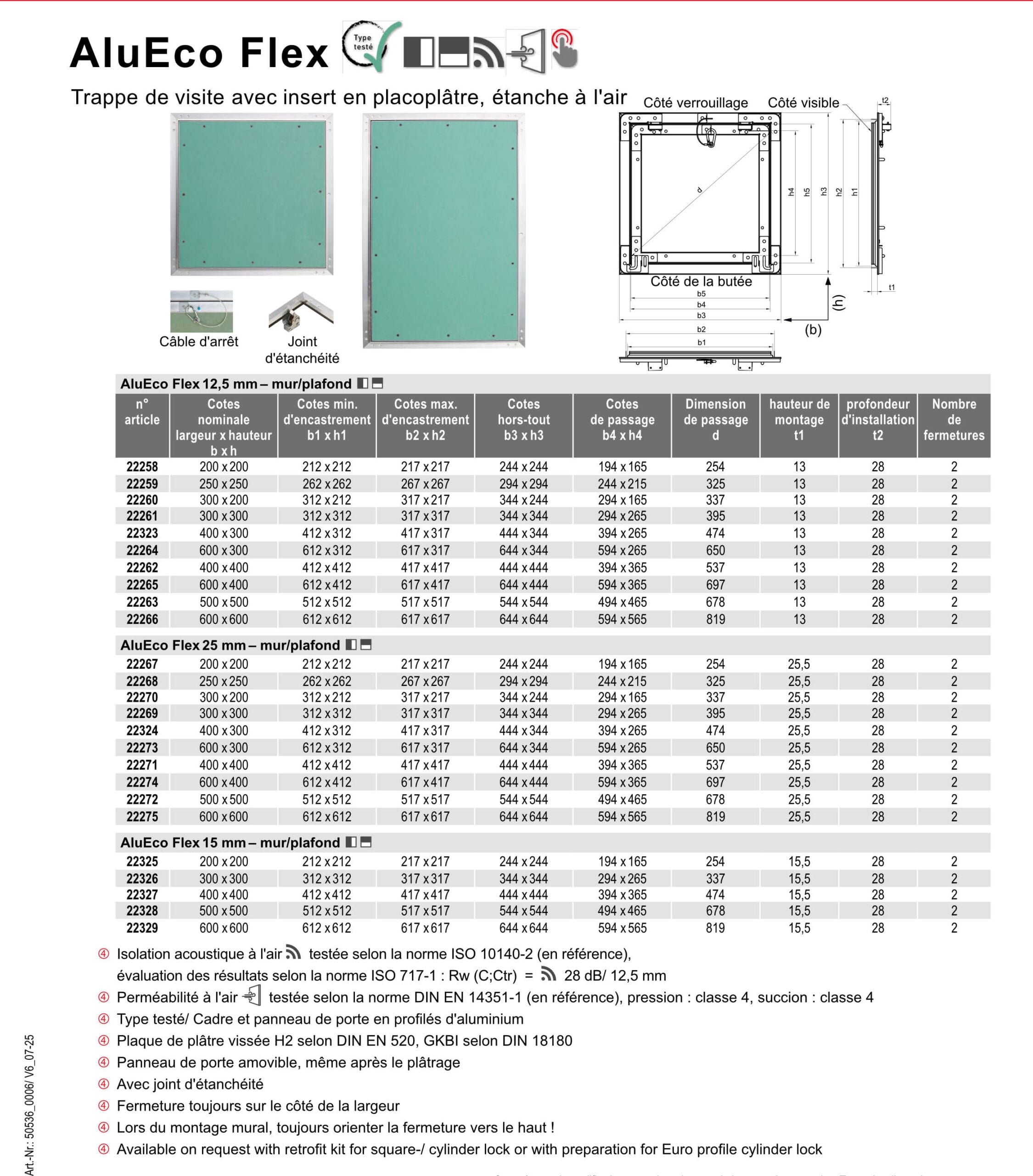 Fabriquée en profilés d’aluminium avec plaque de plâtre H2 vissée (conforme DIN EN 520 / GKBI), elle offre une étanchéité classe 4 (DIN EN 14351-1) et une isolation acoustique Rw = 28 dB selon ISO 10140-2.