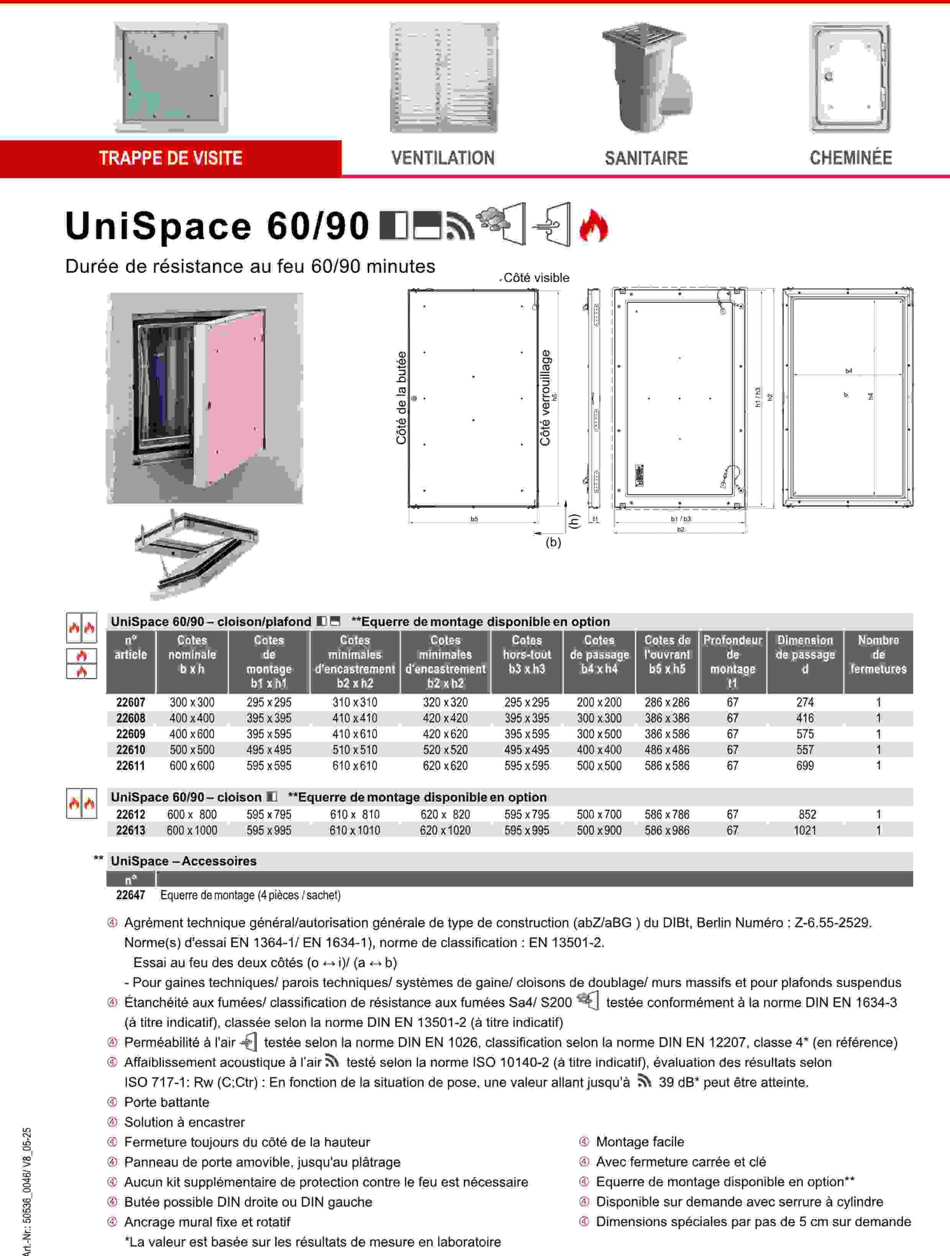 La trappe de visite UniSpace 60/90 est spécialement conçue pour offrir une protection coupe-feu de 60 à 90 minutes, conforme aux exigences de sécurité incendie les plus strictes. Testée selon les normes EN 1364-1 et EN 1634-1, elle garantit une résistance au feu certifiée EI60 / EI90, ainsi qu’une étanchéité aux fumées S4/S200. Son cadre en acier galvanisé et son panneau de porte amovible assurent une grande durabilité et une excellente stabilité mécanique. Grâce à son système d’ouverture à pression, la trappe UniSpace combine sécurité, facilité d’accès et design sobre.Elle est également perméable à l’air classe 4 (DIN EN 12207) et acoustiquement isolante jusqu’à 39 dB selon ISO 10140-2 / ISO 717-1.