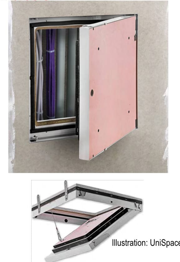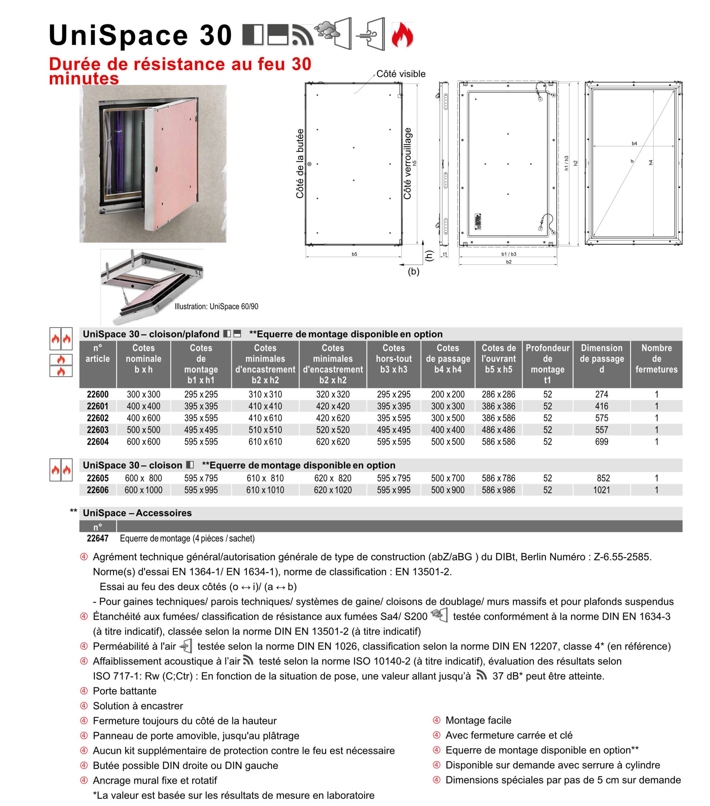 Disponible en plusieurs dimensions (de 300×300 à 600×1000 mm), la trappe UniSpace 30 s’installe facilement en cloison ou plafond.