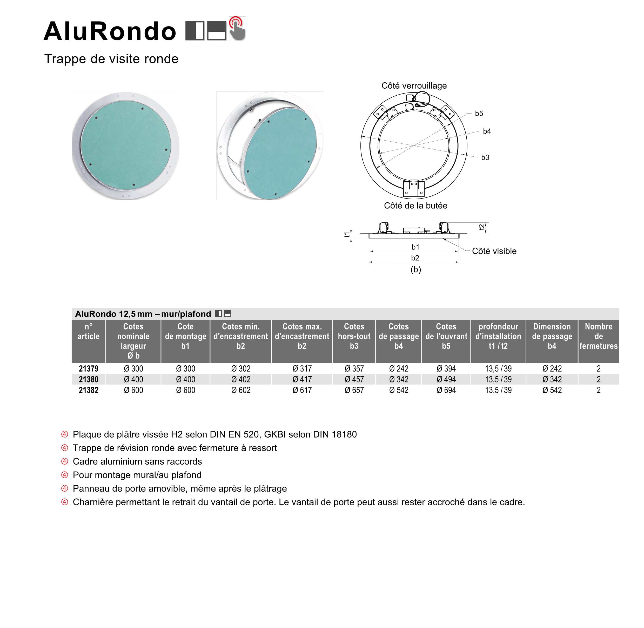 Disponible dans plusieurs diamètres (Ø 300, 400, 600 mm), la trappe AluRondo s’adapte à toutes les configurations murales et plafonnières.